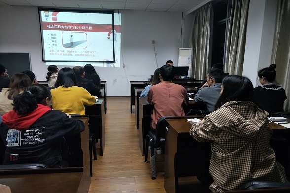 葛军伟学长本科和研究生所学专业均是社会工作。先是分享自己专业学习的心路历程,对社工从疑惑到期待到焦虑再到憧憬的过程。接着是社会工作从业经历分享,列举了几个自己参与的项目和同学们分享了项目管理、项目设计等实务性知识,还通过一些社工在实物过程中遇到的伦理困境案例和大家做经验交流,提出社工的专业性就是和服务对象建立专业关系,在建立专业关系的时候要注意专业关系的长度,把握专业关系的弹性和刚性再次,葛军伟学长和大家探讨了社会工作者职业耗竭及自己的反思,通过他的调查分析,工作环境、机构归属感和同事朋友支持是社会工作者职业耗竭的显著影响因素。最后他认为社会工作者的职业发展前景是好的,现阶段国家层面是越来越重视社会工作的发展。最后以几个社会工作创新服务模式的案例,提出了自己对社会工作者的理解,即社会工作者,是阳关成长下的一份职业。