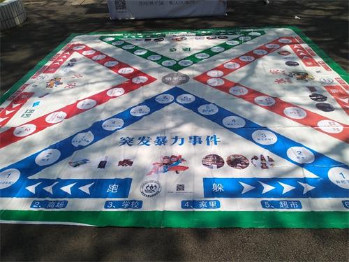 下午的活动为校园安全运动会,在岳麓区古塘小学进行。活动以游戏闯关的形式进行,共设置了盲区大扫雷、烟道逃生、灾害飞行棋、火灾隐患寻找、渡你过河、体育运动隐患标记、危险动作分类等七个游戏项目,把全校分为低年级(1到3年级)和高年级(4到5年级),每关游戏必须全班通过,并有游戏负责人盖章证明才可进入下一环节。
