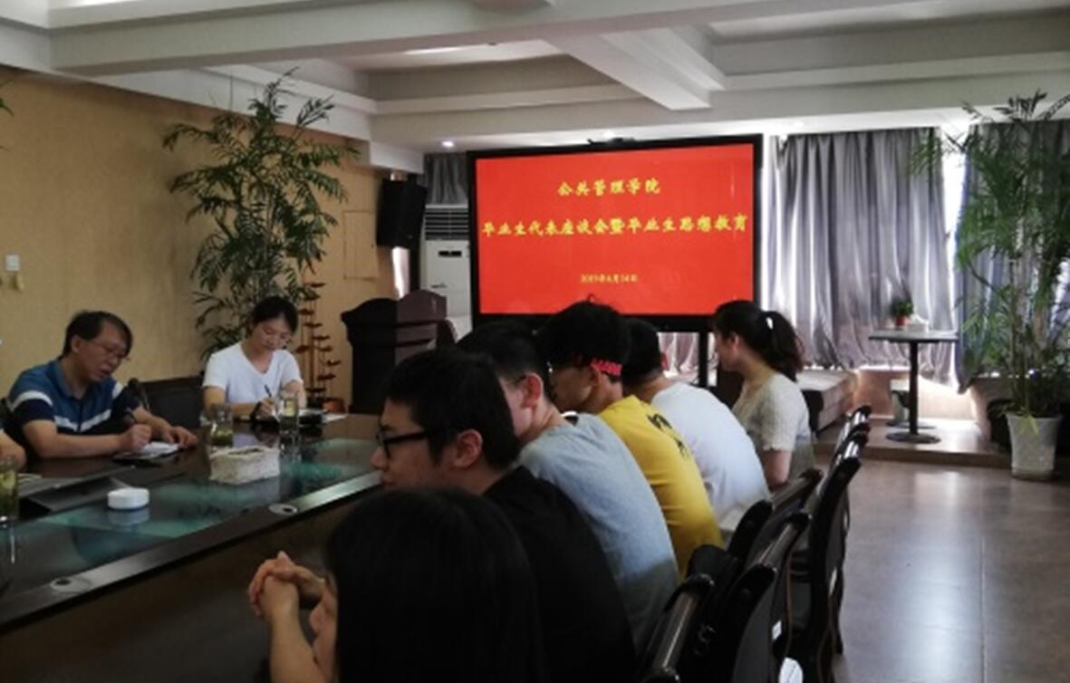 6月14日上午10时在和谐阁,公司开展2019届毕业生座谈会暨毕业生思想教育。公司党委书记刘迪老师,公司党委副书记耿贵斌老师,副经理许源源老师,副经理周谨平老师,副经理董海军老师,行管系系主任刘媛老师,社会学系副系主任颜敏老师,人保系副系主任赵书松老师,哲学系副系主任徐陶老师,学工办主任徐立坤老师,毕业生辅导员梁慧老师,以及2019届毕业生代表们出席了会议。
