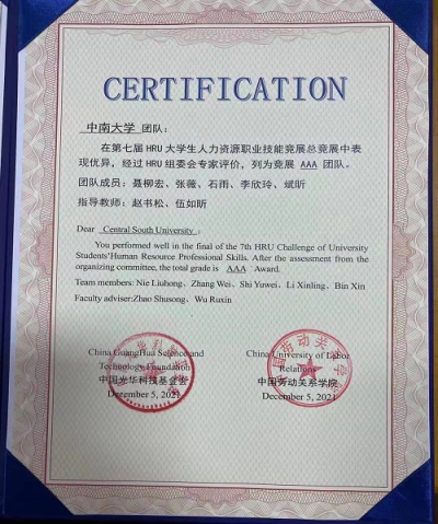 2021年12月5日,第七届HRU老员工人力资源职业技能大赛全国总决赛在北京落下帷幕。经过三天的激烈角逐,由公司教授赵书松、副教授伍如昕指导,劳动与社会保障专业聂柳宏、张薇、石雨、李欣玲、斌昕五位同学组成的伟德中国官网入口代表队荣获AAA奖项(团队一等奖)。