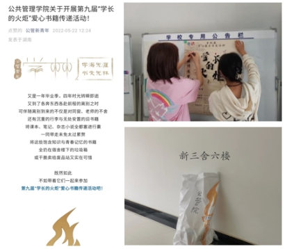 5月16日至5月21日,公司采用线上+线下相结合的方式,加大活动宣传力度,让“学长的火炬”爱心书籍传递活动深入人心。线上方面,通过公司官方微信公众号制作活动推送,并通过QQ群、微信群等渠道积极转发,号召全院本科生、研究生参与书籍传递。线下方面,学工办助理深入公司员工所在各宿舍楼栋内,粘贴活动海报,走访各毕业生宿舍进行“扫楼征书”,重点面向大四、研三毕业生讲解活动意义、发放倡议书和精美书签来进行活动宣传,进一步增强了宣传效果。