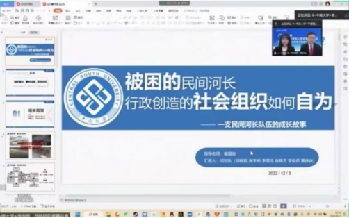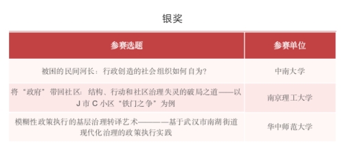 由姜国俊副研究员指导,邱铭韬、李雪珍、张宇奇、赵殊艺、李俊茹、黄梓焱团队提交的参赛作品《被困的民间河长:行政创造的社会组织如何自为?》斩获银奖。
