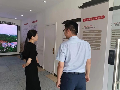 在长沙市开福区沙坪街道党工委委员、组织委员黎佳乐的陪同下,实践团一行在竹安驿站一楼展厅进行参观学习。实践团从竹安驿站了解到在以邓学东为代表的“五老”感召下,竹安村一批乡贤回乡投资,搭建了牵头产业运营的平台公司,统筹竹安村内所有农业产业项目运营,有序启动了研学、民宿和非遗传承等项目建设。乡贤助力乡村振兴,竹安村借助乡贤与村民之间的枢纽作用,开展文明实践活动,推进竹安村产业发展。
