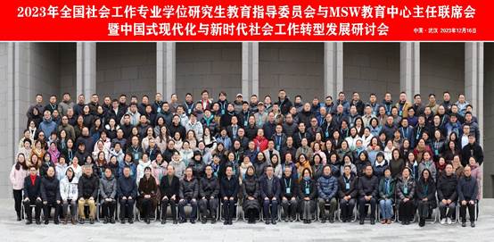 20231216日至17日,由全国社会工作专业学位研究生教育指导委员会主办、华中师范大学社会公司和社会工作专业学位研究生教育中心承办的全国社会工作专业学位研究生教育指导委员会与MSW教育中心主任联席会暨中国式现代化与新时代社会工作转型发展研讨会在武汉举行。来自北京大学、清华大学等150余所高校的280余名专家学者以及相关政府部门和群团组织的领导出席,公司副经理潘泽泉教授、社会学系主任彭远春老师参会。