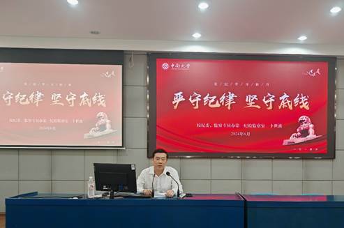 为落实公司纪委“一院一宣讲”及党纪学习教育工作安排,实现纪律教育对教职员工的全覆盖,营造风清气正的公司氛围。6月19日下午,校纪检监察机构第一纪检监察室主任卜世波在公管楼404报告厅作了题为“严守纪律,坚守底线”的廉洁教育专题宣讲,公司党政班子成员、全体教职工党员参加了会议,会议由公司党委副书记、纪检委员耿贵斌主持。