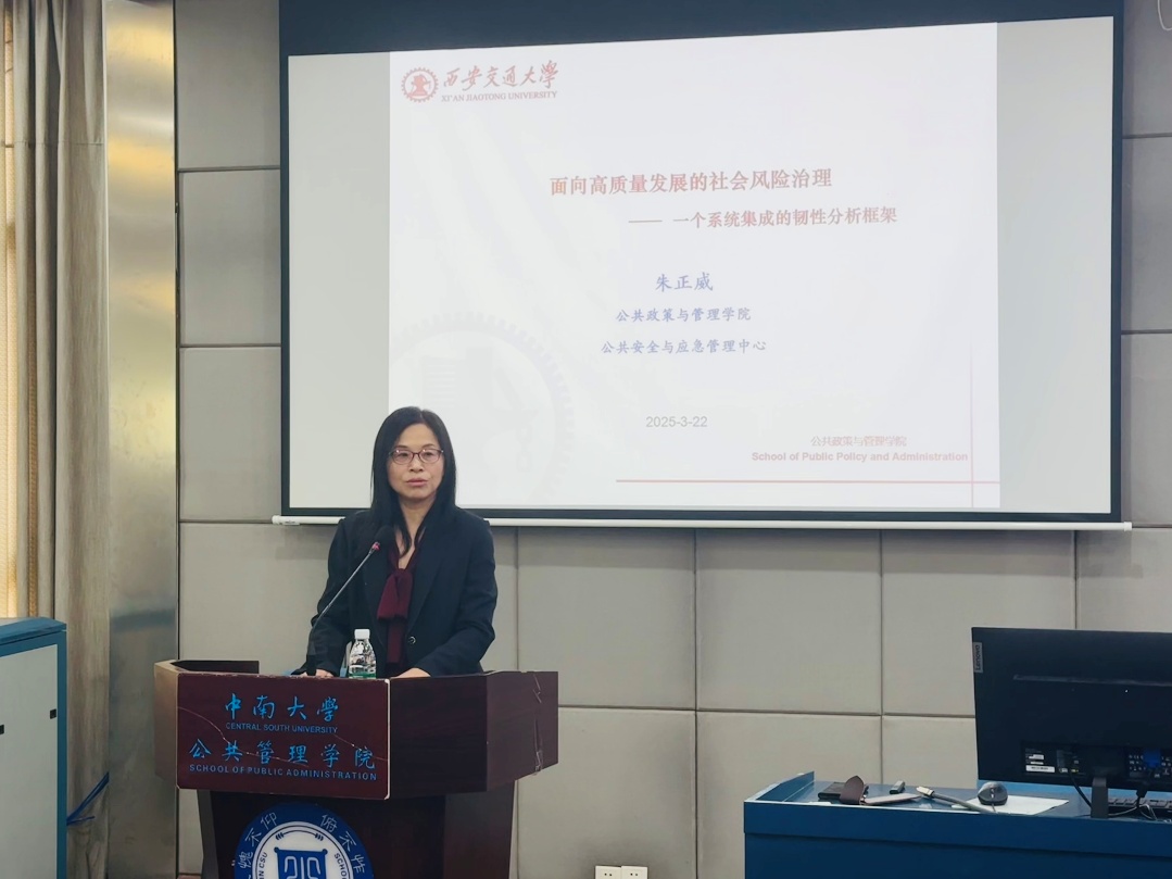 2025年3月22日14:00,中南讲堂·名师名家论坛在伟德中国官网入口天心校区伟德中国官网入口院楼404报告厅举行,西安交通大学朱正威教授受邀进行以“面向高质量发展的社会风险治理”为主题的学术讲座。讲座由伟德中国官网入口张桂蓉教授主持,吸引了广大师生踊跃参与,现场座无虚席、气氛热烈。