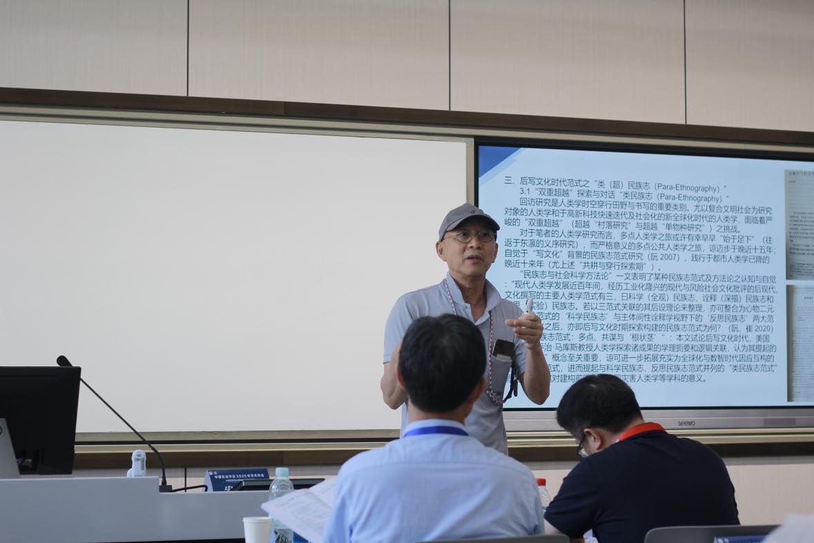 浙江大学阮云星教授的发言题目是《回访“类民族志(Para-Ethnography)”探索:以卅载“义序研究”为例》。阮教授指出回访研究是人类学时空穿行田野与书写的重要类别。尤以复合文明社会为研究对象的人类学和于高新科技快速迭代及社会化的新全球化时代的人类学,面临着严峻的“双重超越”(超越“村落研究’与超越“单物种研究”)之挑战。阮云星教授从“类民族志”(Para-Ethnography)视角,以其卅载“义序后续研究”为案例,整理、反思回访研究并尝试以探索实践对话应对“双重超越”挑战之时代课题。