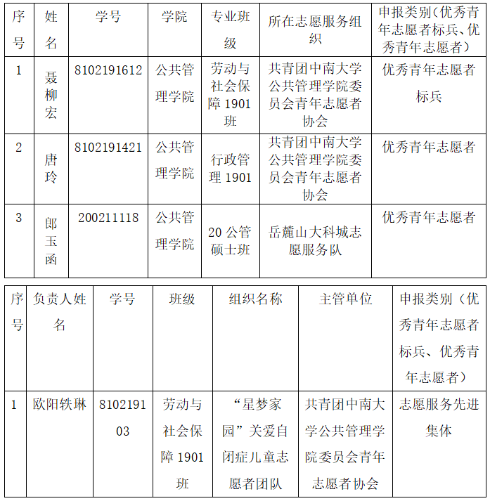公示期从2021.11.19起,公示三天。如有疑义,请在公示期内向公司优秀青年志愿者、优秀青年志愿者标兵、志愿服务先进集体、优秀志愿服务项目遴选推荐工作小组反映,联系电话:闵迪0731-88876575,邮箱:csumindi@163.com。
