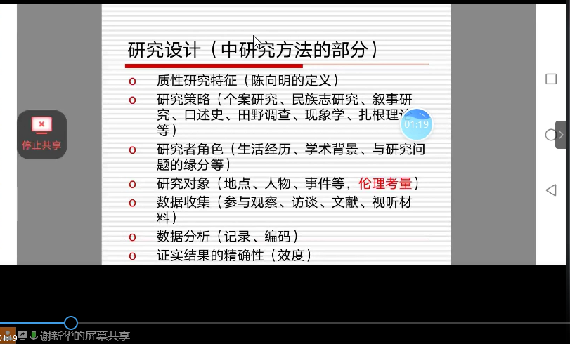 对《质性研究方法》这门课程的教学,谢老师采用慕课(线下自学)+QQ群(资料分享、+安排学习任务+作业提交+交流互动)+腾讯会议(老师讲授、员工分享)的形式进行。由于临近期末,在本次线上课堂中,谢老师首先回顾了本课程全部教学内容,并提醒同学们在质性研究中选题、准备、实施、总结各个阶段应该注意的问题,掌握质性研究的写作规范,为项目研究以及学年论文、毕业论文的撰写奠定良好基础。根据研究设计在整个质性研究中的“承上启下”作用,谢老师以一篇优秀的本科生毕业论文为案例,并结合抗疫斗争实例为同学们阐释了研究设计中研究方法所应包括的各个环节。
