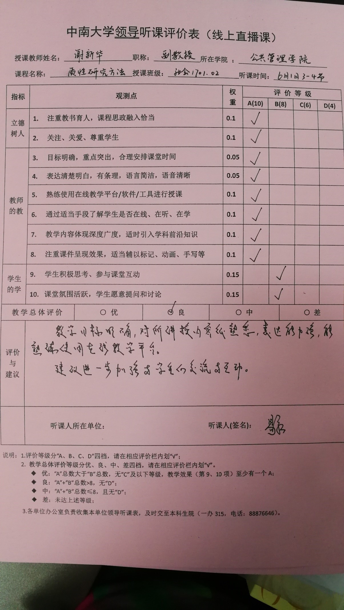 课后,参与听课的校领导、督导和老师们高度评价了本次课程,同时也希望该课程进一步加强师生互动,激活线上直播课程。参与听课的老师们表示,听课有了新的学习体会。谢新华老师感谢老师们的反馈意见,表示将继续推进教学改革,改进教学方法,提升教学效果。公司此次在线直播公开课圆满完成。