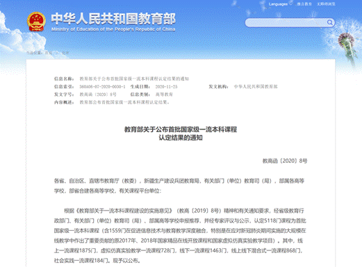 近日,教育部发布了《关于公布首批国家级一流本科课程认定结果的通知》,认定了5118门课程为首批国家级一流课程。