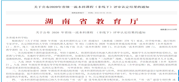 近日,湖南省教育厅发布了《关于公布2020年省级一流本科课程(非线下)评审认定结果的通知》。