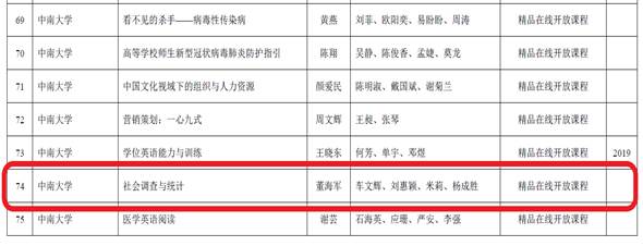 由董海军教授作为主要负责人,车文辉教授、刘惠颖教授、米莉副教授、杨成胜副教授作为团队成员的《社会调查与统计》课程被认定为2020年湖南省一流本科课程精品在线开放课程,是董海军教授团队在2020年获得国家首批线下一流本科课程之后在调查研究方法教学上的又一成绩,争取线下与线上课程建设实践的齐头并进。《社会调查与统计》自2019年年底在中国大学MOOC上线一年多来,受益员工达16000余人,至2020年底使用本课程开设SPOC课程的高校达14所,学习人数998人,跨区域、跨公司推动东中西部高校共享优质课程资源,在深化高校公司产品改革方面取得了显著成效。
