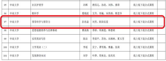 由彭忠益教授作为主要负责人,刘芳老师、欧阳辰星老师作为团队成员的《领导科学与领导力》课程被认定为2020年湖南省一流本科课程线上线下混合式课程。《领导科学与领导力》课程缘起于本世纪初团队所开出的《行政领导学》,经历近20年的发展,从专业核心基础课逐步拓展出了专业选修课、卓越拔尖人才人文素养选修课、全校性选修通识课,形成了领导学系列课程体系。2018年开发了慕课《领导科学与领导力》,开始了混合式教学模式的尝试,迄今已经在中国大学慕课网、智慧树、学习强国等平台上线。先后获评校级开放式精品课程、省级精品课程等。