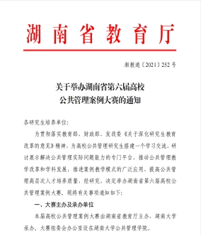 公司积极组织研究生参加由湖南省教育厅主办、湖南大学承办的“第六次高校公共管理案例”大赛。负责本次参赛队伍的选拔工作由公司公共管理学科及MPA教育管理中心共同组织。