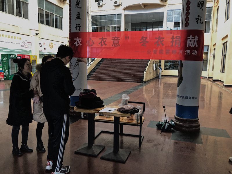 316日上午,在校本部三五食堂一楼广场,摆好桌子,开展冬衣捐赠活动的衣物收集环节。活动过程中,吸引了公司、粉冶院、资安院等全校各公司的同学踊跃捐献。捐献者将自己的衣物整齐地装在袋子里交到捐献处,爱心衣物在春季里交接,暖意在心中流动。一天时间里,我们收集了大大小小十几袋爱心衣物,并运到升华后楼711室暂时保管。