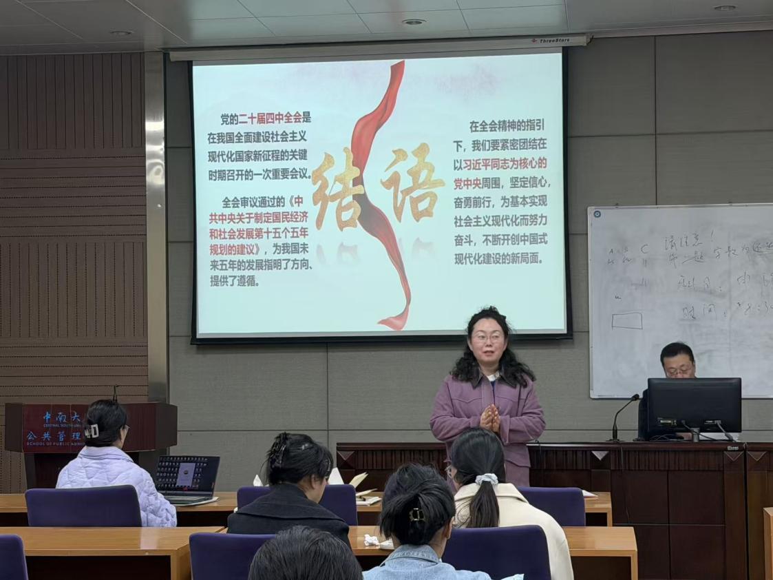 专题党课结束后,米莉老师作为社会学博士生党支部书记,结合博士生党支部建设和公司产品实际,对全体党员提出明确要求。她指出,学习贯彻党的二十届四中全会精神,既是重要政治任务,也是加强博士生党员思想政治建设的重要契机。全体博士生党员要坚持用党的创新理论武装头脑、指导实践,把政治站位贯穿学术研究全过程,自觉把个人科研追求融入党和国家事业发展大局,把论文写在祖国大地上。