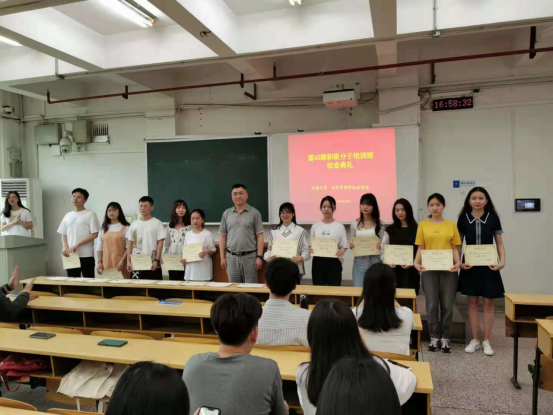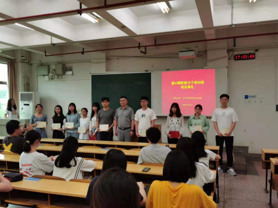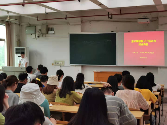 国歌毕,闵老师宣布本次入党积极分子培训班结业情况,并宣读优秀学员标兵、优秀学员获得者名单。第43期积极分子培训班共118名学员,包括本科生59人、研究生59人,全部顺利结业,培训成果喜人。