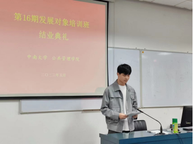 随后,公共管理2022硕士班黄梓焱同学作为培训班学员代表上台发言。他对党组织给予这次宝贵的培训机会以及各位老师的教导表示衷心的感谢,并分享了自己在培训过程中的心得和感悟,表示在接下来的学习和生活中将不断努力,严格要求自己,为实现中华民族伟大复兴的中国梦不懈奋斗。