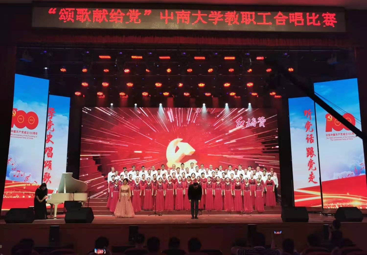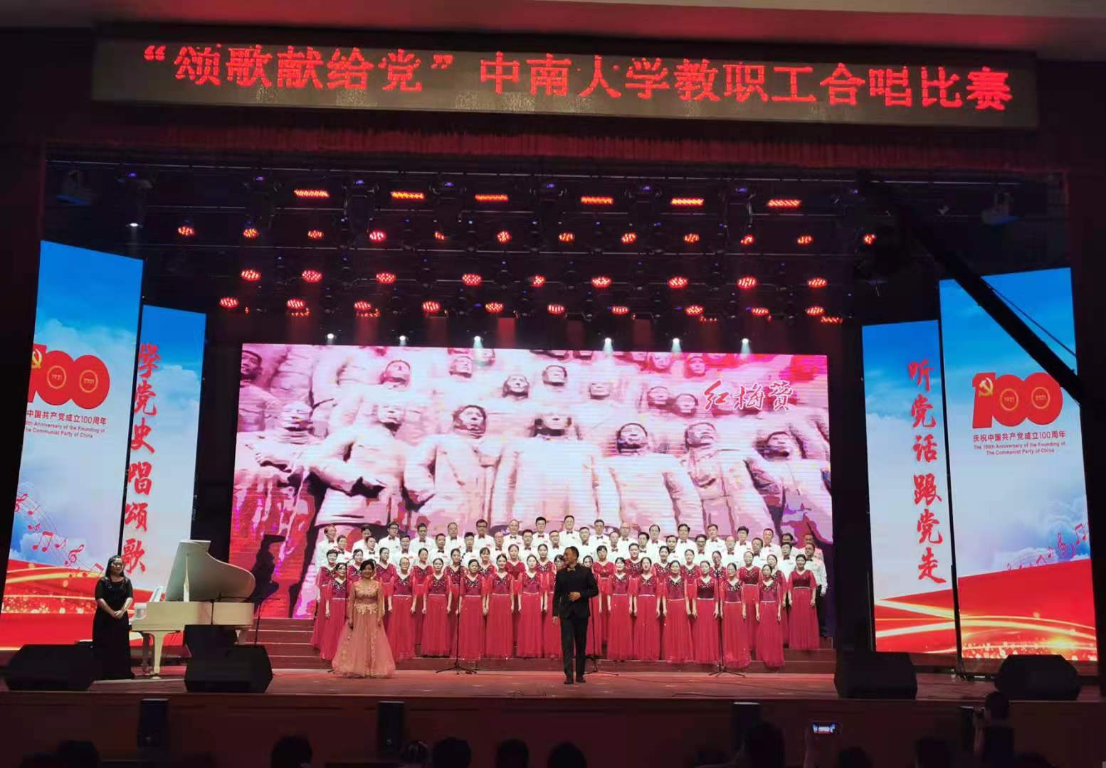 6月20日下午,在铁道大礼堂,举行全校性教职工合唱比赛。经过1个多月的合唱练习,由公司党委书记刘迪带队,公司教职工70人精神抖擞、意气风发地走向舞台,由李玲老师领唱、王育霖老师指挥,演唱一曲《红梅赞》,献礼党的百年华诞。
