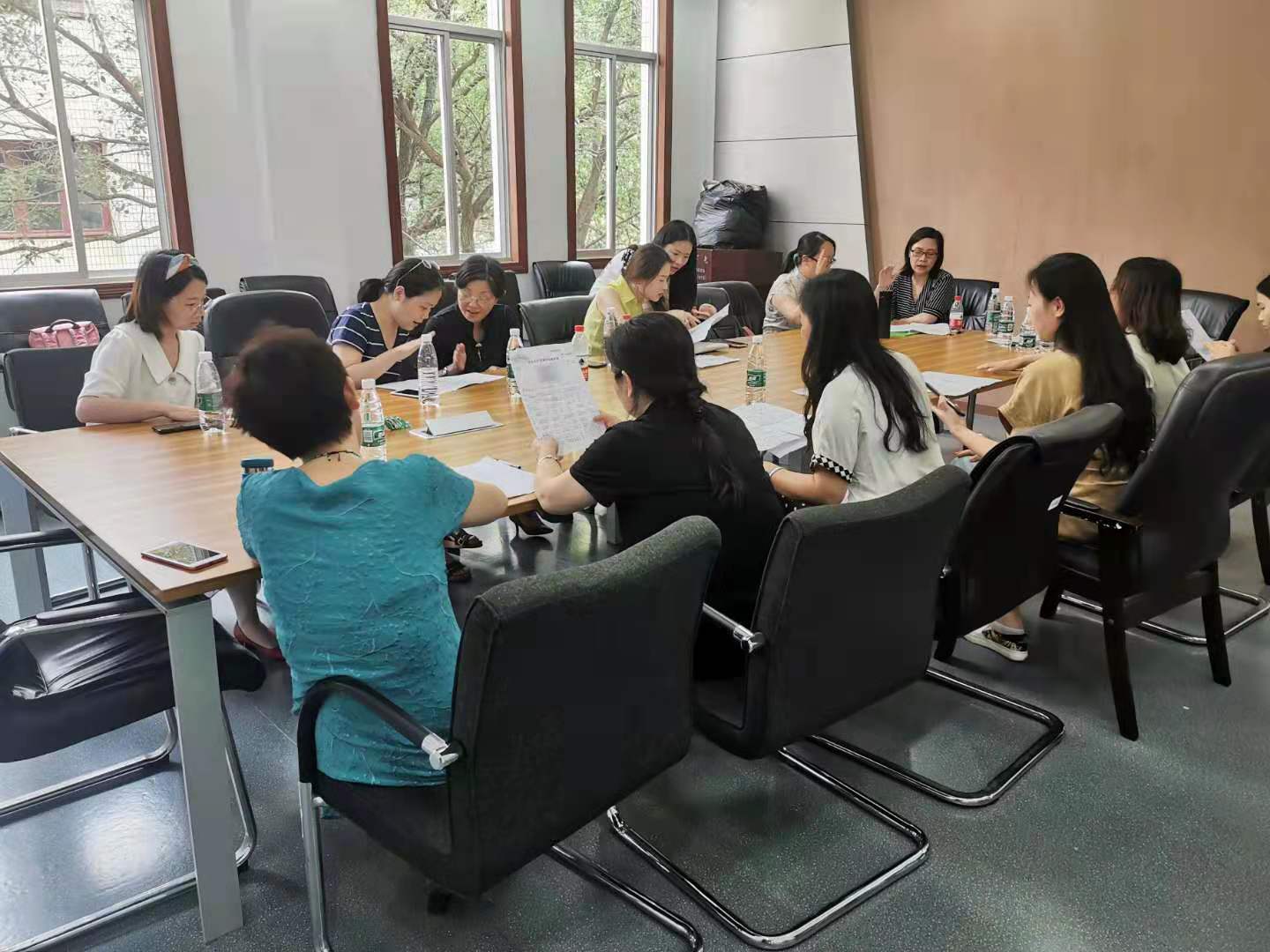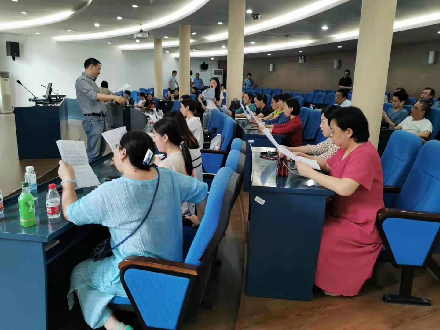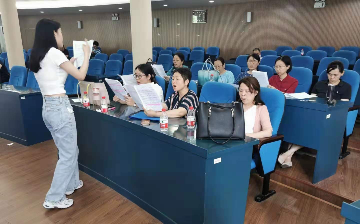 此后,公司工会组织合唱教职工于每周三下午固定时间、固定地点,男高声部在院楼307女高声部院楼308男低声部在院楼404女低声部在院楼405,进行了十余次分声部练习。院楼里时常萦绕着教职工婉转嘹亮的歌声,使大家更有热情、更有积极性地开展工作。参与合唱的教职工们牢记每次合唱练习的时间和地点,克服空闲时间不统一的实际困难,发扬团队协作精神,积极参与每次合唱练习。排练过程中,教职工如有特殊情况均及时向各声部组长报告请假,保持了较好的组织性和纪律性。工会委员们也积极做好合唱比赛的服装采购、背景制作、化妆订餐等各项准备工作。