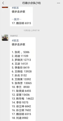 活动要求在12月1日当天,教职工自主选择场地完成一次健步走,最低步数5000步,距离不设上限,速度不做要求。截至12月1日晚24点,公司共95名教职工通过群接龙,步数截图等方式晒出实际步数,响应活动号召。