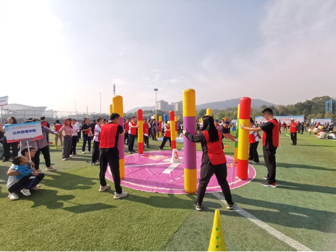 当天上午8点,趣味运动会在庄严的国歌声中拉开了序幕。公司党委书记杨旭东、经理许源源,公管系刘媛、陈文琼、付名琪,社会学系韦晓丹、张晓倩,党政办王晓佳、张莉、王进、岳忠强、孙炎,教务办罗晓洪、艾晓果、李兰、贾晓锋,学工办徐立坤、梁慧、张宇奇等19位老师,组成公司教职工代表队,团结一心、奋力拼搏,依次参加了精打细算、趣味飞盘、鸿运当头、同心协作和屹立不倒等五个项目的比赛。