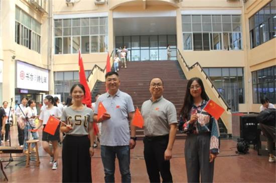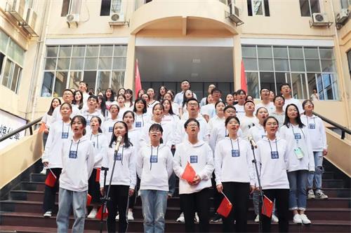 随着表演的临近,观众们也被形式新颖、意义斐然的活动吸引,越来越多的人驻足观看。待到活动正式开始,指挥员一个手势,悠扬的伴奏响起,两名主唱从人群中缓缓走出,合唱的同学迅速聚拢。歌声冉冉升起,汇聚着回荡在广场上空,红旗飘扬,观众们也被现场气氛所感染,不约而同地加入合唱,抒发着对祖国的无限热忱与赞颂,将快闪活动推向高潮。