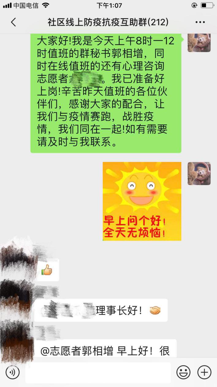 18级社会工作硕士郭相增参与了公益社会组织在所处社区开展的线上志愿服务,通过招募医务、心理方面的持证老师及一般志愿者们,为社区居民提供线上的一些服务,为社区居民、社区工作者提供疫情科普、信息咨询、心理抚慰、情绪支持等方面的服务。