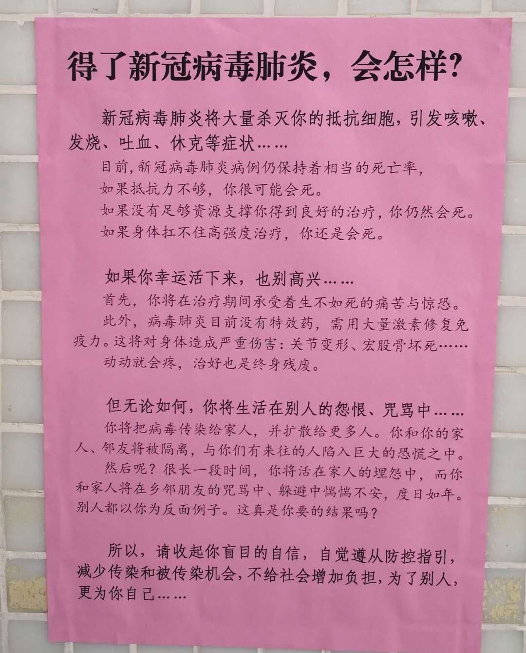 “得了新冠病毒肺炎,会怎样?”一张红纸上,硕大的黑体字标题横贯其上。红纸上的内容以第二人称叙述,仿佛有个人在当着你面放狠话: