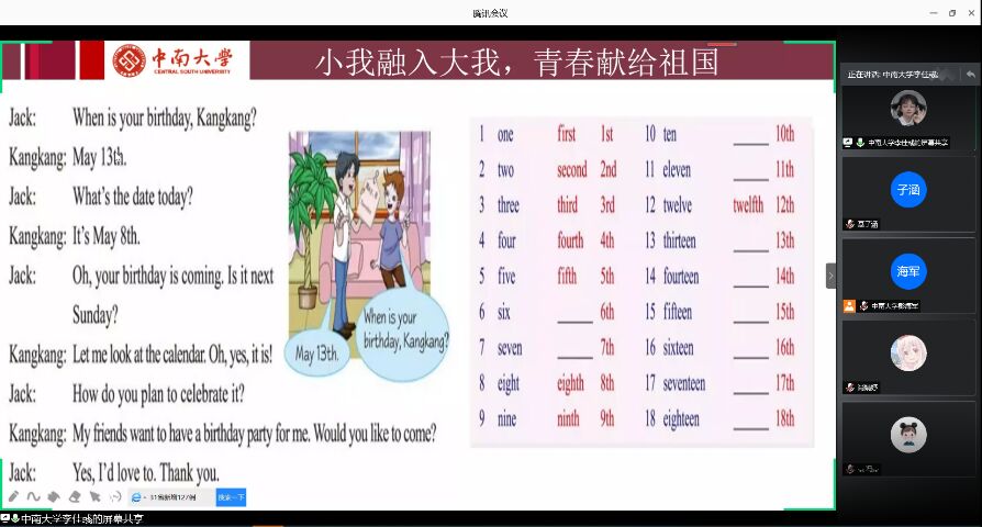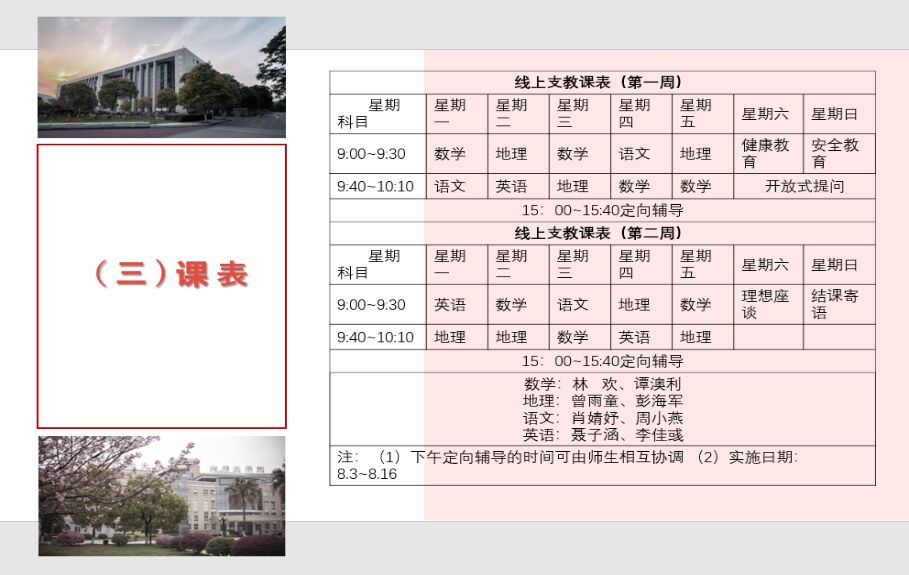 7月31日上午10时,团队成员提前做好了备课工作,与火峰中学的校领导、对接班级的班主任连麦进行了试讲,随后,根据听课领导和老师们的建议对授课方案进行了修改。 8月2日上午9时,支教团与七年级同学及其家长们举行了线上见面会,就实践主题、团队成员、教学安排和奖励机制等向与会人员进行了详细的介绍。