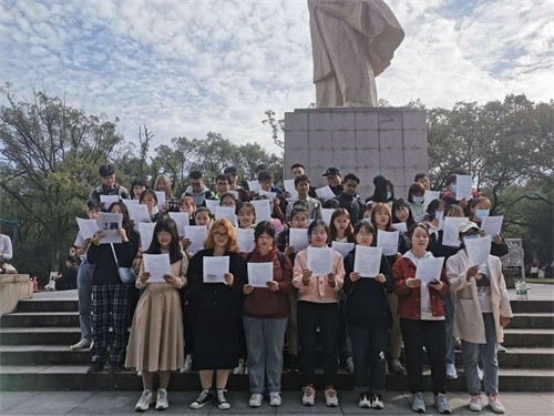 下午3时,行政1901班与劳保1901班全体同学在长沙市岳麓区东方红广场的毛主席雕像前集合。在瞻仰了毛主席雕像、感受了一代伟人的革命精神之后,全体同学激情朗诵了毛主席的《沁园春.长沙》,引得过往行人纷纷驻足观看。
