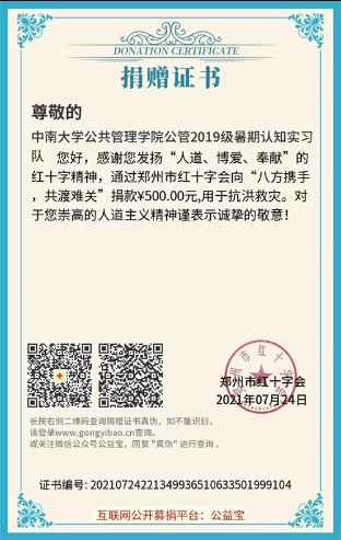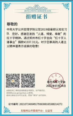 近日,河南省郑州市连降暴雨引发险情,牵动着全国各地人民的心。公司尚在实习中的行管劳保实习队不忘关注国家大事,于7月23日晚在实习基地一楼设置捐款箱,号召同学们积极捐款驰援河南灾区。另外,行管1901班班委同时开放网上捐款方式,统一收集同学们所捐款项。截止至7月24日,行管1901班和劳保1901班同学及实习带队老师向河南郑州市红十字会“八方携手,共渡难关”和“红十字人道事业”两个项目共捐款1837.31元。