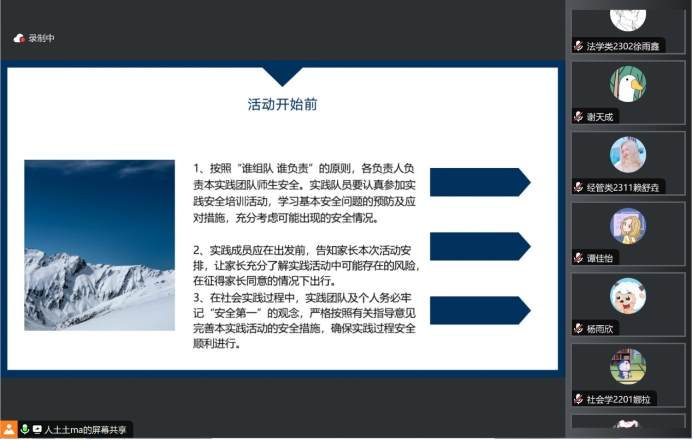 马佳同学从实践安全须知、投稿注意事项和实践项目要求三个方面为大家展开培训。首先,马佳同学从人身安全、财产安全、饮食安全等方面介绍实践中的安全注意事项,强调了树立“安全第一”实践观念的重要性。接着,在活动宣传方面,马佳说明了活动新闻稿和推文撰写的要点,鼓励大家积极投稿宣传。之后,强调了实践活动的申报要求与申报流程,说明了公司寒假社会实践的后续事项。