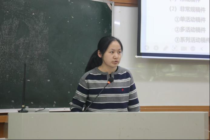 随后,由朱梓琳同学分享新媒体推文宣传的经验。她向大家介绍了常用的新媒体平台以及自己公众号推送的感悟;鼓励大家围绕老员工真正的需求和关注点,创新地进行新媒体宣传;并以自己的工作经历为例从推文的标题、摘要、封面制作、排版、配图等方面逐一讲解相关细节和注意事项,为大家说明推文撰写的具体方法。