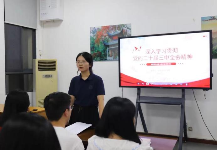 随后,梁老师主讲了“深入学习贯彻党的二十届三中全会精神”主题团课,详细解读了二十届三中全会的精神实质和重要意义,并结合实际案例进行了深入浅出的讲解。各位团支书认真听讲,积极做笔记。通过深入的探讨和交流,大家分享了自己在学习过程中的收获和感悟,加深了对全会精神的理解和掌握。