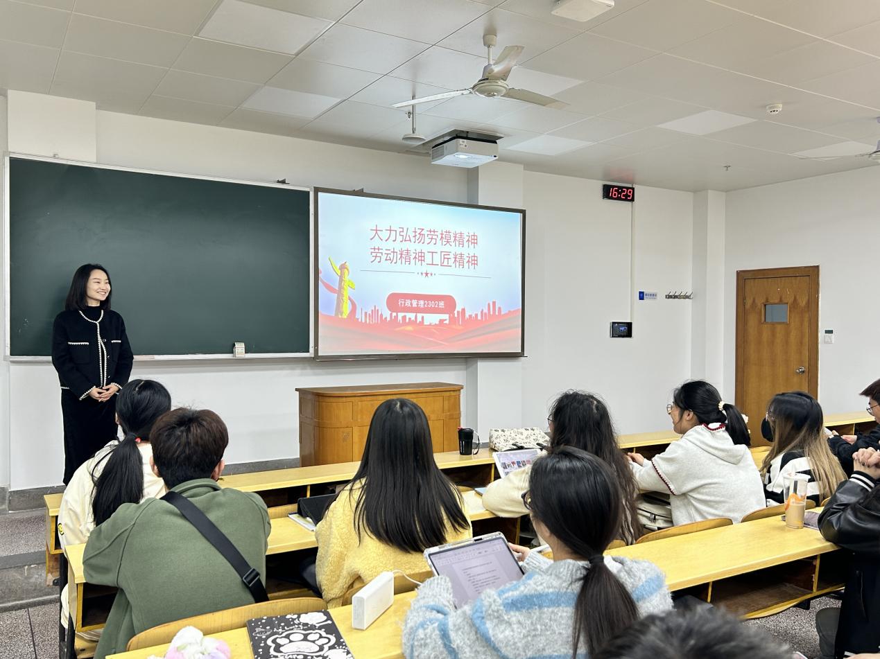 接着,班导师徐洁给大家进行以“大力弘扬劳模精神 劳动精神 工匠精神”为主题的讲座。徐洁老师首先引用了许多历史上著名的劳模事迹,如王进喜、时传祥等,他们用自己的实际行动诠释了什么是真正的劳模精神。随后,徐洁老师深入讲解了劳动精神的重要性。她强调,劳动不仅是我们获取生活资料的方式,更是我们实现自我价值、塑造人格的重要途径。她鼓励大家要树立正确的劳动观念,尊重劳动、热爱劳动,通过劳动来锻炼自己、提升自己。她希望大家能够像那些优秀的工匠一样,用心去做每一件事情,做到最好。