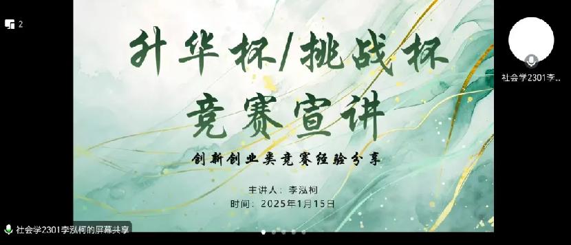 随后,由优秀项目负责人李瞿皓曦、李泓柯为同学们分享经验,提供可借鉴的范例与启示。在团队分享环节中,他们根据自己的参赛经历,分享了自己参与竞赛、寻找队友的经验,向大家明确了各大竞赛的流程,并强调了参赛的重要意义以及充分了解赛事的重要性。李瞿皓曦同学提醒大家在准备作品时要根据赛事要求,注重原创性和创新性,确保符合参赛指南和评分标准,以及在报名参赛时多关注公司官方消息,按时在线提交完整准确的申报书和相关材料。李泓柯同学为大家在答辩路演时提供了经验指导,要根据评分标准完善项目书和PPT,掌握开场白、逻辑词使用等答辩技巧,避免过渡语句不自然、缺乏重音等常见表达问题。