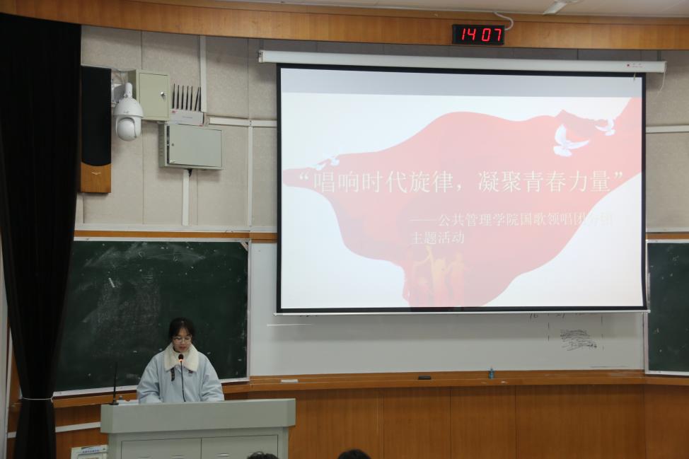 活动伊始,主持人吴雅涟介绍了关于国歌的相关知识以及奏唱国歌的注意事项,让同学们对奏唱国歌的行为规范有了更清晰的认识。随后,主持人讲述了国歌发展的历史进程。从革命时期到新时代,义勇军进行曲在经历风雨征程之后在新中国焕发新生,展现了中华民族不屈不挠的精神。