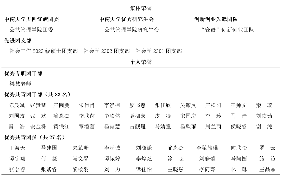 此次受到表彰的个人及集体,用实际行动展现了公管青年积极向上、奋发进取的精神面貌,为全院青年做出了榜样,树立了标杆!希望受表彰的个人和集体珍视荣誉,牢记总书记嘱托,赓续前行。展望未来,公司团学组织将以此次表彰为新起点,坚持以习近平新时代中国特色社会主义思想为指导,聚焦立德树人的根本任务,团结引领广大团员青年向模范学习、向先进看齐,以实际行动回应总书记期望——怀爱国之心、立报国之志、增强国之能,将个人理想融入民族复兴伟业,持续为全面建设社会主义现代化国家注入强劲青春动能。