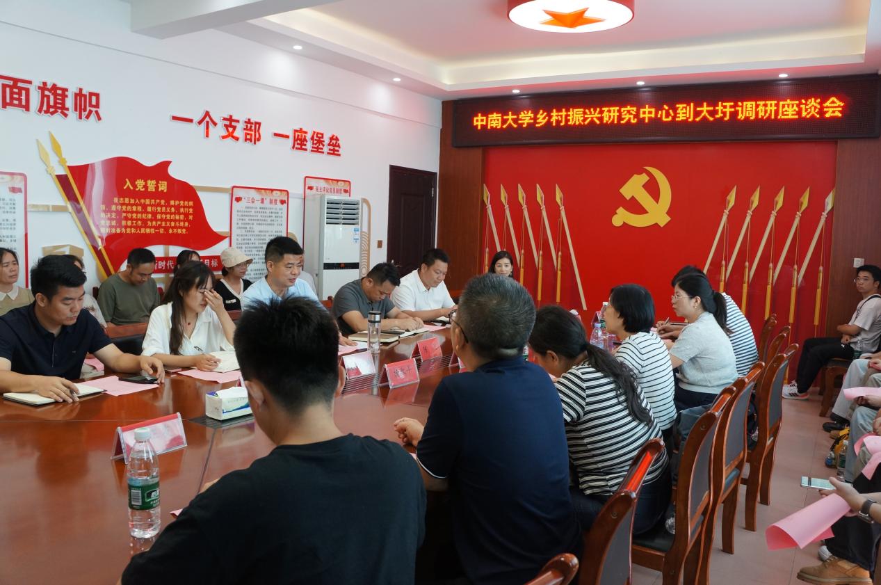 当日上午9时,实践团抵达江华县大圩镇,与镇党委书记陈飞、镇长尹天虎及相关部门负责人举行专题座谈会。会上,陈书记及负责人从产业、生态、文化、民生等多维度系统介绍了大圩镇乡村振兴的实践成果。当地通过培育特色产业,重点扶持农产品加工和特色种植,充分发挥资源禀赋优势;同时成立行业协会,规范市场秩序,优化营商环境,推动产业规模化发展并打造稳定品牌。此外,大圩镇积极探索“产居融合”新模式,实现了“家门口就业”与“产业培育”的双赢局面。