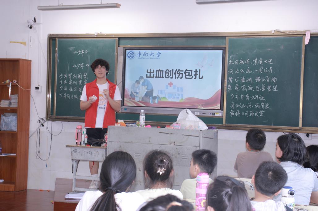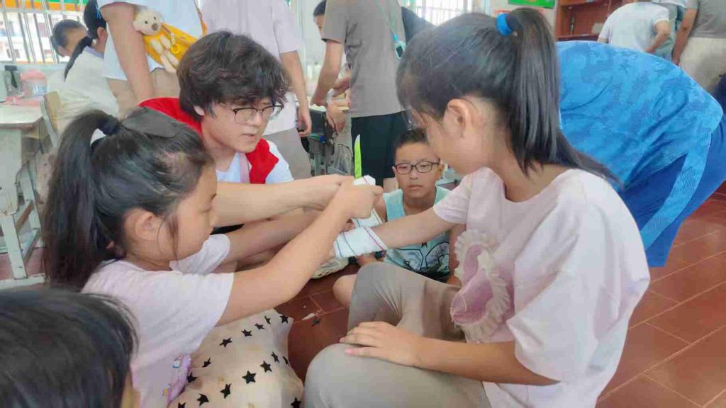 创伤包扎环节则充满互助温情。视频教学后,同学们化身“示范员”,三角巾与绷带在稚嫩的手中认真穿梭。当老师为最佳“急救员”戴上象征荣誉的小红花,实用的技能已经与互助的温暖、实践的成就感融为一体。