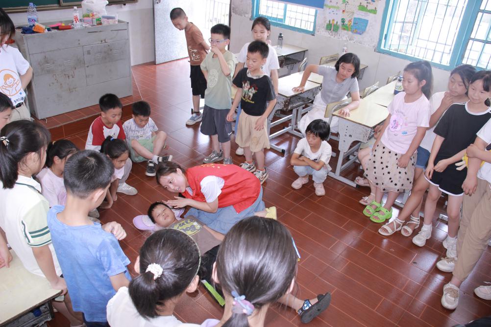 当日下午,团队将“自信力”的培育延伸至生命守护的领域。在专业而活泼的急救课堂上,“30次胸外按压”与“2次人工呼吸”的关键数字被孩子们迅速牢记。小模特安静躺在“枕头胸腔”上,七八位同学轮番上阵,在老师指导下认真调整按压姿势,体验施救者的责任与力量感。