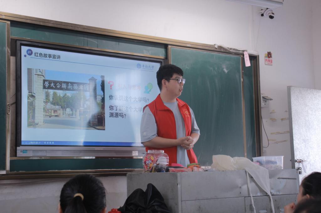 讲述完七七事变,团队成员以时间轴为线索,沿着历史的脉络,向孩子们还原了西南联大在抗战烽火中坚守教育阵地的故事。当屏幕上出现土坯墙、茅草顶的校舍照片以及联大老师在风雨中授课的情景,孩子们的心绪从七七事变的悲恸变为如今的敬佩,眼神中闪烁着坚定的光芒。团队用这样一个革命摇篮的故事在孩子们心中种下责任与爱国的新芽,期待着未来的某一天长成参天大树。