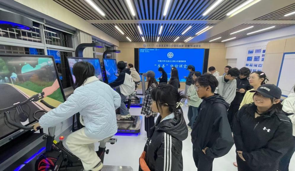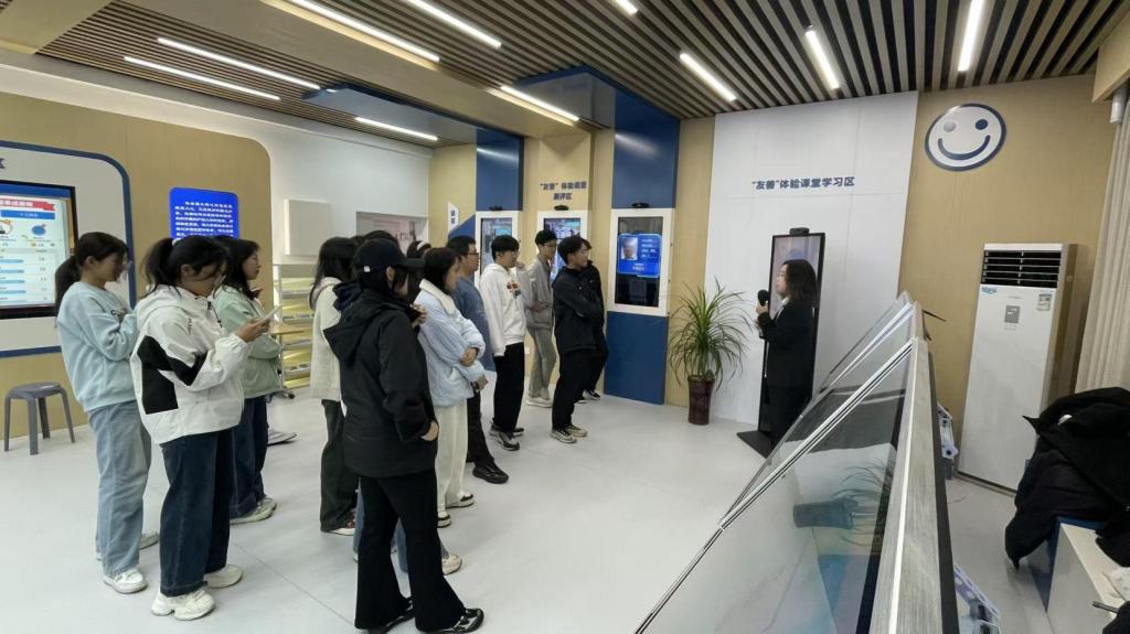 在专业讲解员的引导下,同学们依次探访了课堂内测评、学习、体验、践行四大特色区域。大家先与依托豆包AI知识库的辅导员AI助手小麓开展智能互动,感受多语种语音交互的便捷与精准;接着分组参与“友善小事接力骑行”活动,在校园真实场景任务中默契协作,体悟友善合作的实践意义;随后借助MR混合现实技术的友善数字沙盘“云游”六大校区,探寻隐藏其中的校园友善故事。各环节层层递进,让同学们在直观体验中感受“友善”的丰富内涵,在互动实践中掌握践行友善理念的方法路径。