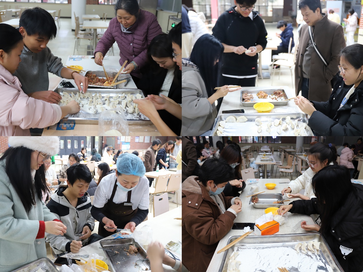 活动在欢声笑语中拉开帷幕。食堂早已整齐摆放好准备好的面皮、多种新鲜馅料和各类工具。师生们有序领取工具后,围坐在一起,和面、擀皮、包馅、捏边,手法由生疏至熟练,气氛也由起初的稍显拘谨转为自然融洽。老师们不时亲手示范,同学们互相交流技巧,分享所思所感,传递真诚的关怀与鼓励。