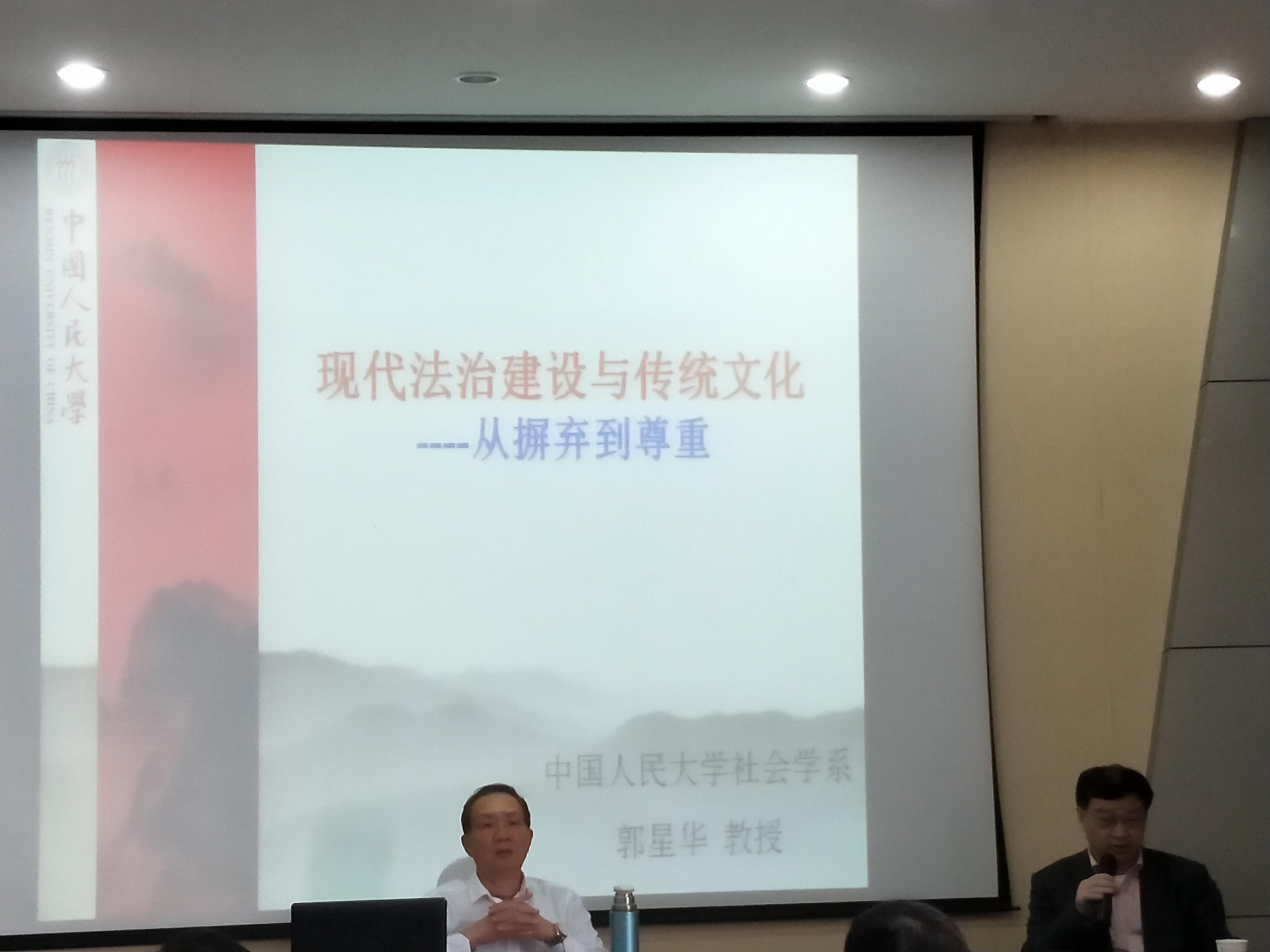 接着,郭教授以“现代法制建设与传统文化——从摒弃到尊重”为主题开始了他的演讲。郭教授认为中国传统文化思想是我们中华民族经过几千年来的创造、发展、吸收、融合、批判、扬弃而逐步形成的一个内容非常庞大而又繁杂的复合体,其中既有精华,又有糟粕。所以对它持简单地肯定或者简单地否定的态度,都是不可取的。郭教授由“于欢案”引出沉思:在现代性扩展的进程中,“传统”被赋予什么样的形象、这种形象是如何被建构的以及这种建构对“传统”的命运会造成何种影响。通过介绍两项司法改革(即“亲亲相隐”来代替“大义灭亲”和有关父母给子女购买不动产的产权归属规定)的文化意涵,指出现代法治建设向传统的法文化以及人伦精神归复。郭教授认为中国近代以来的法律改革总体上走的是西化的路子,这种法制建设路径镶嵌了东方主义逻辑。