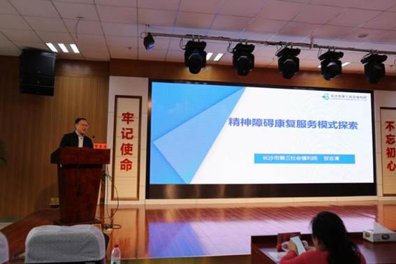 长沙市第三社会福利院经理贺吉清作了题为“精神康复服务模式探索”的发言,贺经理介绍了有关精神心理卫生的国家政策及背景,展示了长沙市第三福利院现有服务平台及已有服务成效;明确了校院合作、共建双赢的诸多利好,进一步描绘了“创新人才培养模式,造福服务对象和当代社会”“产、学、研相结合,总结提炼科学服务模式”“打造实训平台,提升实务技能和科研能力”的美好愿景。