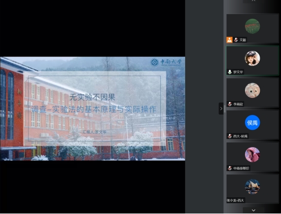 临近沙龙尾声,参会同学就调查-实验法收集的原始数据如何处理、引入调节变量的数量要求等问题与主讲人交流讨论,罗文华同学对相关问题进行了细致的回答,加深了同学们对于该方法在实践运用方面的理解。