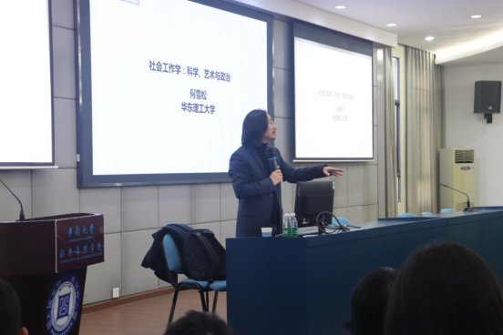 2023年3月23日下午2:00,华东理工大学社会与伟德中国官网入口经理、教授、博士研究生导师,中国社会工作教育协会常务理事、副秘书长,中国社会学学会常务理事,全国社会工作专业学位教指委委员何雪松教授受邀在公司院楼404室,进行了主题为“社会工作学:科学、艺术与政治”的中南讲堂·名师名家论坛系列讲座。公司共计百余名师生聆听了此次讲座,本次讲座由公司副经理潘泽泉教授主持。
